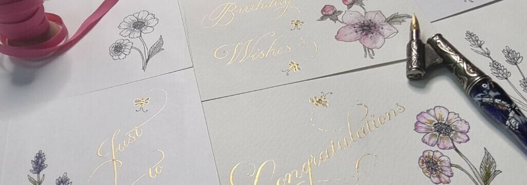 Over the course of two days you will learn how to use a fine point nib and practice the strokes required to construct the alphabet and particularly the letters you choose to make a floral card.
